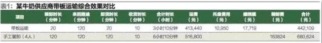 以某牛奶供应商为例,由数据对比说明带板运输的实施效果。某牛奶供应商带板运输前后对比,见表1。