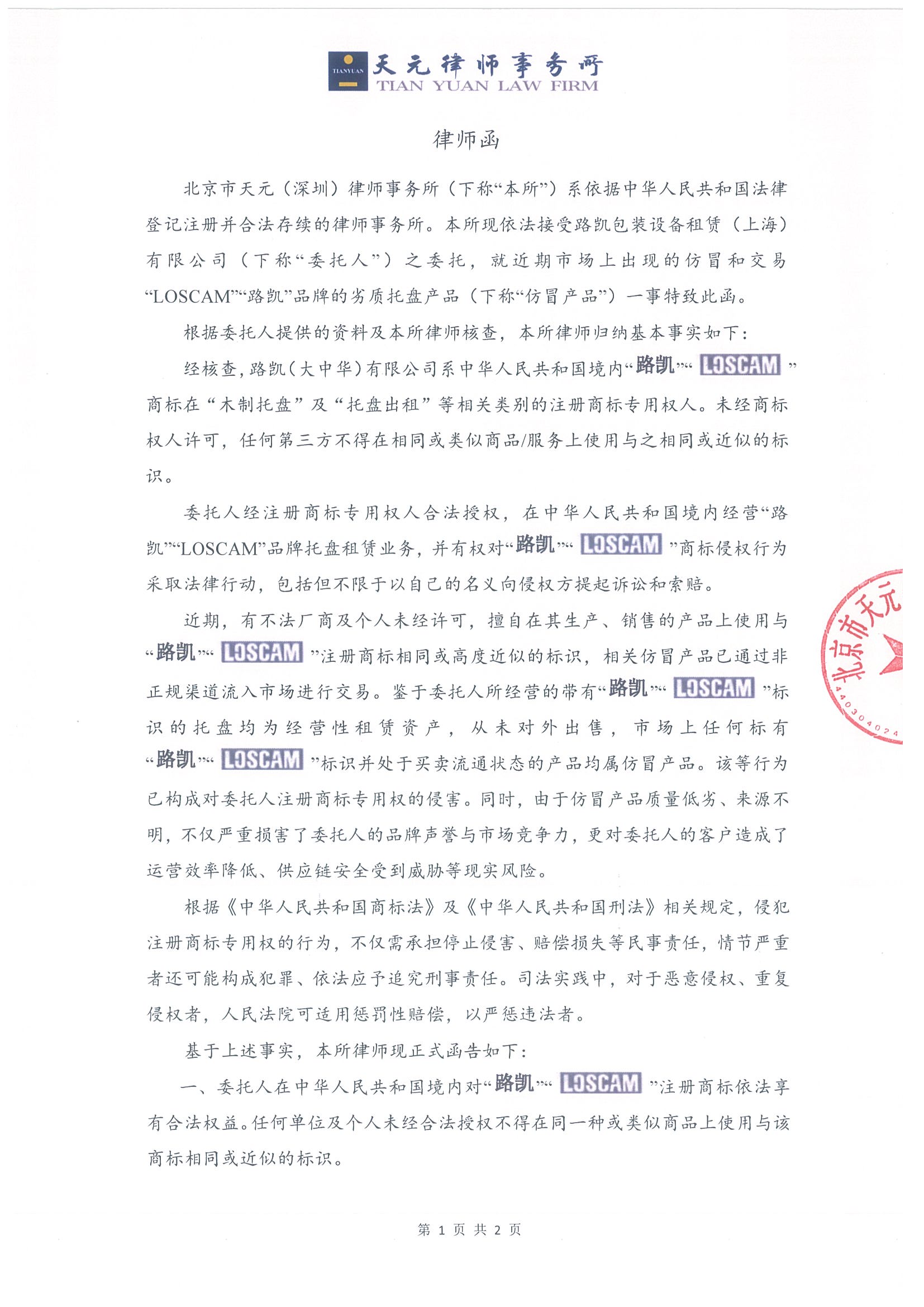 近期,有不法厂商及个人擅自冒用我司注册商标、生产、销售劣质假冒的路凯托盘产品,并通过非正规渠道流入市场。鉴于路凯托盘均为经营性租赁资产,从未对外出售,此类低质仿冒产品,不仅严重扰乱正常市场秩序,更对合作客户的供应链稳定性与安全性造成严重影响,对路凯品牌声誉、知识产权及客户的合法权益构成严重侵害。